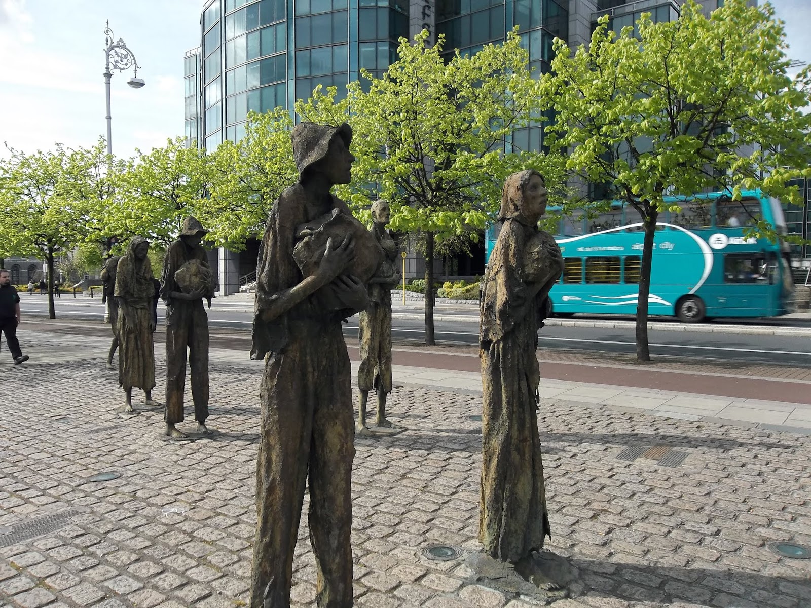 Destaque para o ‘Famine Memorial’ localizado na região portuária de Dublin. O monumento representa as ‘Estátuas da Fome’ do escultor Rowan Gillespie, inaugurada em 1997, simbolizando a grande fome que ocorreu na Irlanda em meados do século XIX (1845-1849). Durante esse período triste, 1 milhão de pessoas morreram de fome e mais 1 milhão de irlandeses deixaram o país, reduzindo a população da ilha em cerca de 25%.